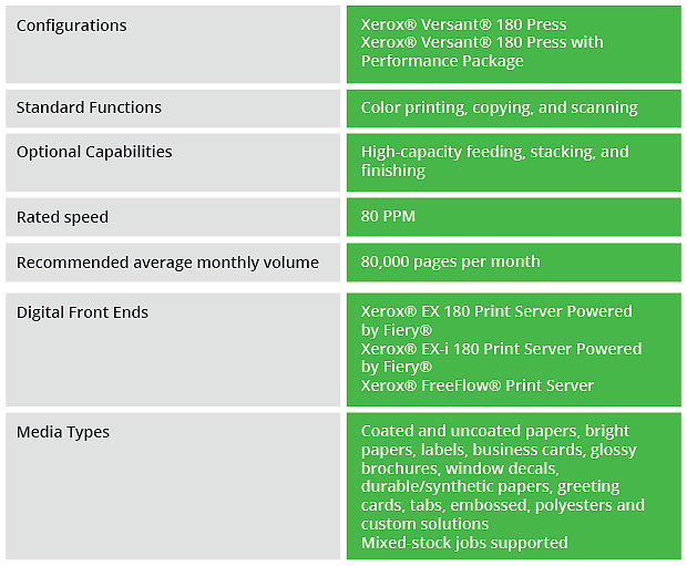 The Versant® 180 Press takes your print operation to the next level with automation and quality in a compact footprint. Add the Performance Package for enhanced productivity and speeds. The Performance Package option delivers full rated 80 ppm on all stocks up to 350 g/m², adds automated color calibration with X-Rite® Inline Spectrophotometer